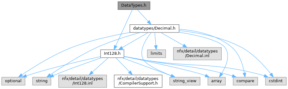 Includes all numeric types: Int128 and Decimal. This single header provides convenient access to the entire nfx::datatypes namespace. For selective includes, use individual headers from nfx/datatypes/ subdirectory.