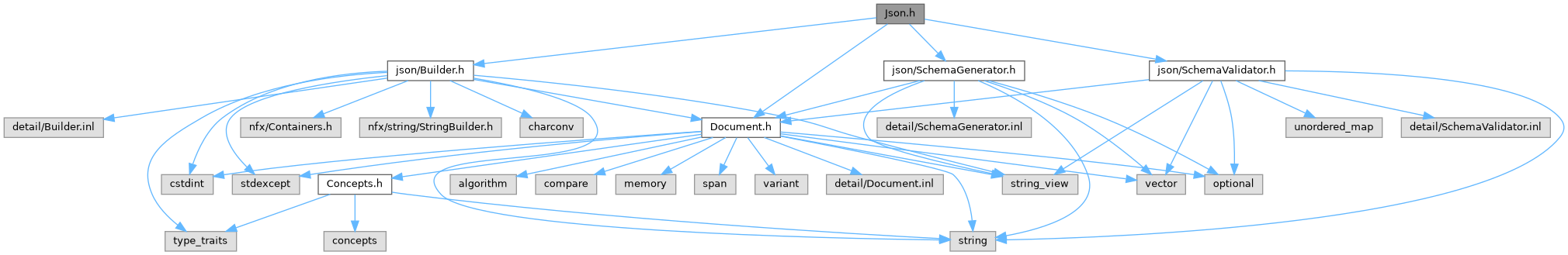 Includes all JSON components: Builder, Document, SchemaGenerator, and SchemaValidator. This single header provides convenient access to the entire nfx::json namespace. For selective includes, use individual headers from nfx/json/ subdirectory.
