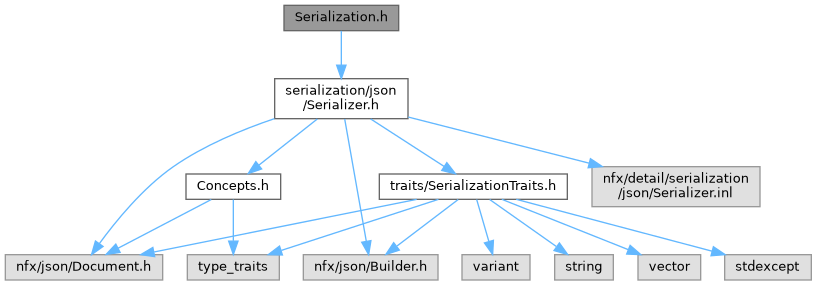 Includes C++ type serialization components: Serializer and SerializationTraits. This library provides bidirectional conversion between C++ types and JSON, built on top of the nfx-json library. For selective includes, use individual headers from nfx/serialization/json/ subdirectory.